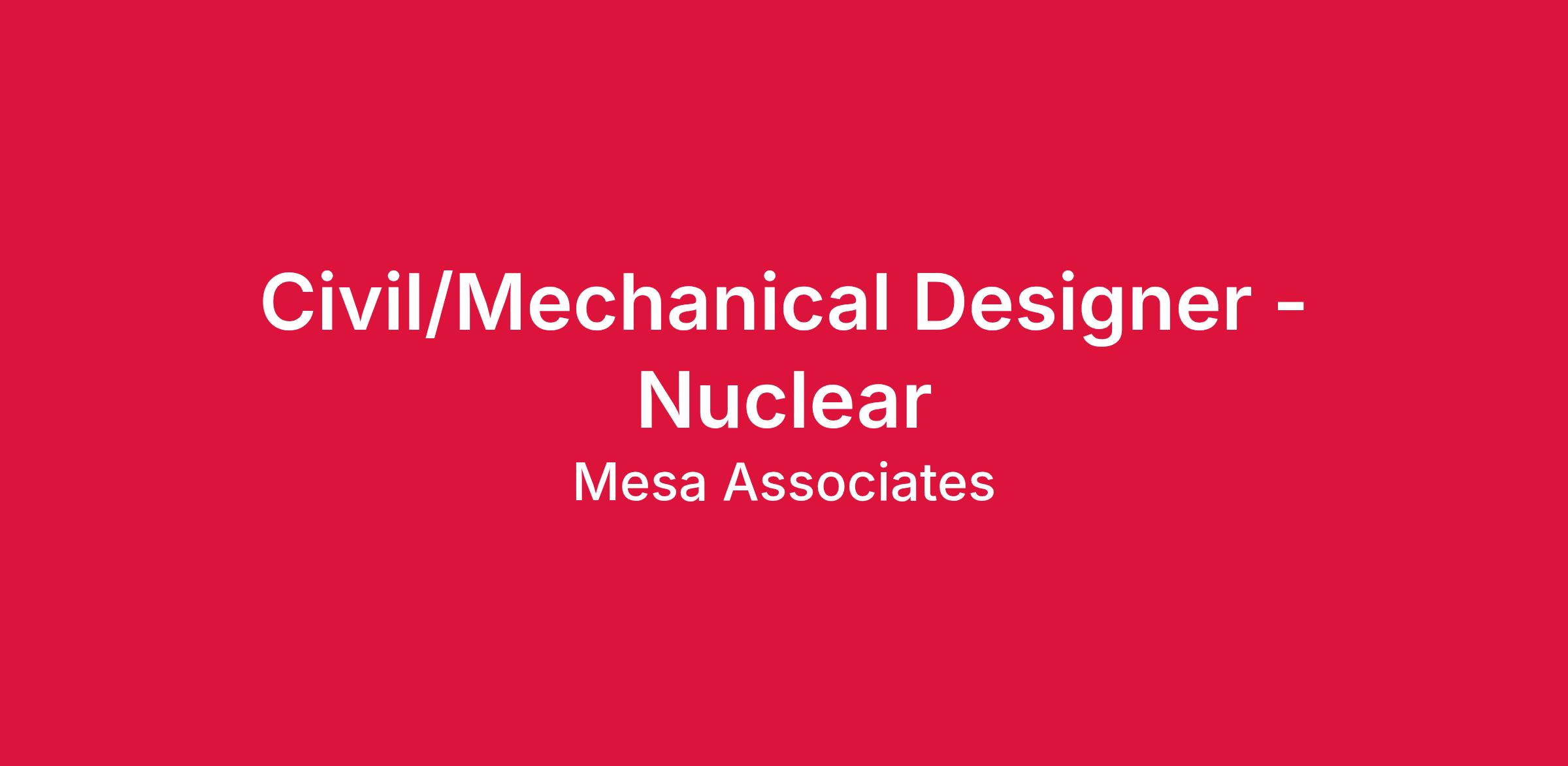 Mesa Associates is seeking a Civil/Mechanical Designer to join our nuclear services team and contribute to the design development of modifications and new designs related to nuclear facilities. This is an opportunity to play a critical role in the engineering and design processes for commercial nuclear power generation. Mesa's strategic growth strategy for our commercial nuclear division is to create a ready service pool of available staff to support proposals and projects in nuclear generation.