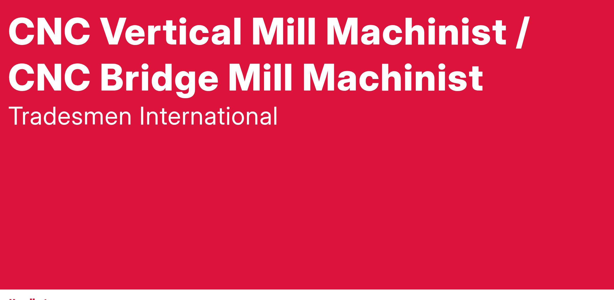 Tradesmen International is immediately hiring experienced CNC Vertical Mill Machinists / CNC Bridge Mill Machinists for projects located in the Green Bay, WI area. This is a full time opportunity, and the pay rate is $35/hour based on experience plus $100/day per diem for Travelers 60+ miles from the job site. If you are a CNC Vertical Mill Machinist / CNC Bridge Mill Machinist eager to master your skills alongside other accomplished Craft Professionals, this is your chance to advance your career!