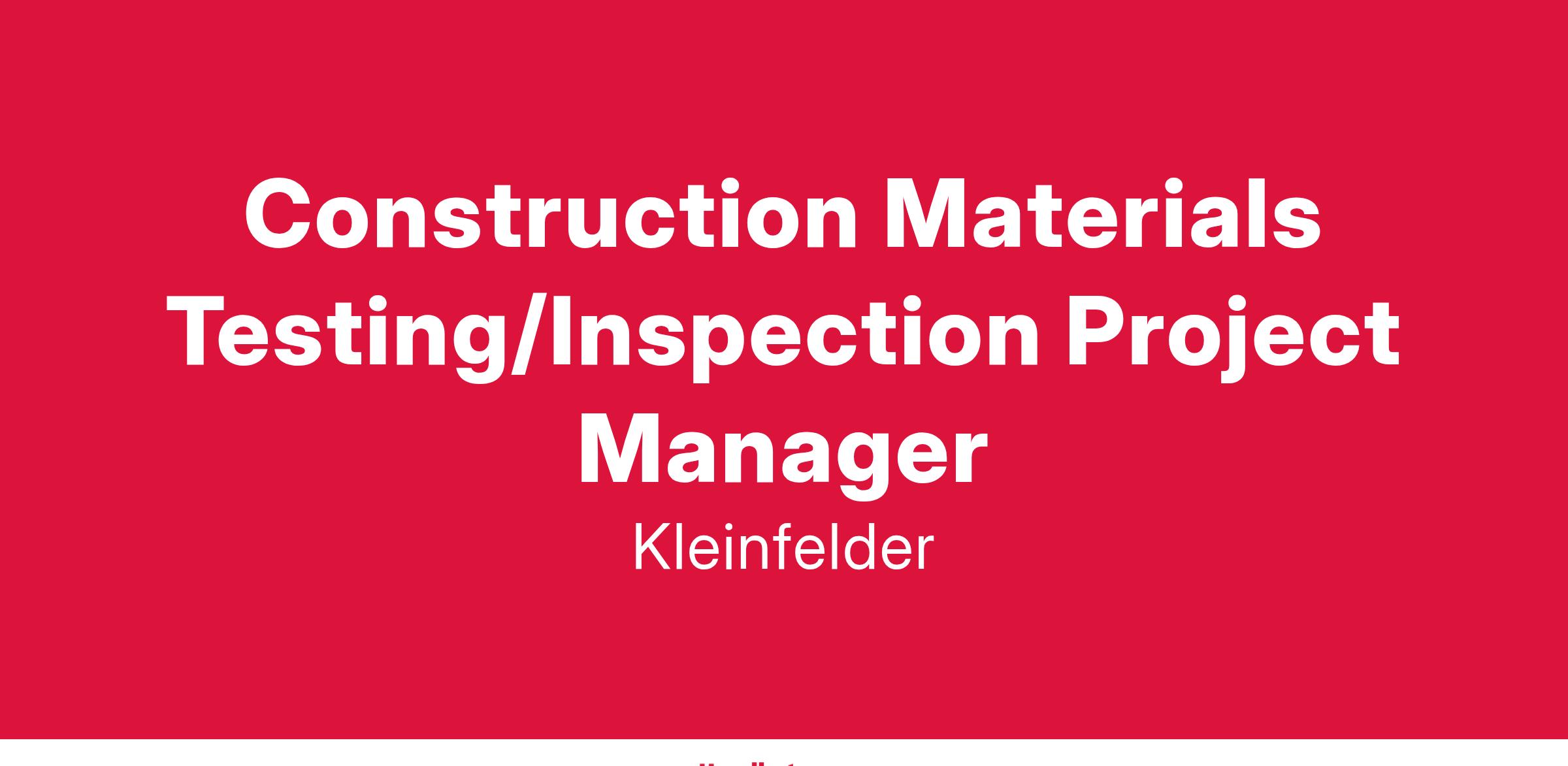 Kleinfelder's Irving, TX office is seeking an experienced Construction Materials Testing Project Manager to work within our existing Construction Services Group and focus on developing and leading our efforts in the market in the Dallas metro area. This position will drive sales, improve project execution, and supervise a motivated and growing team of inspection and testing professionals.