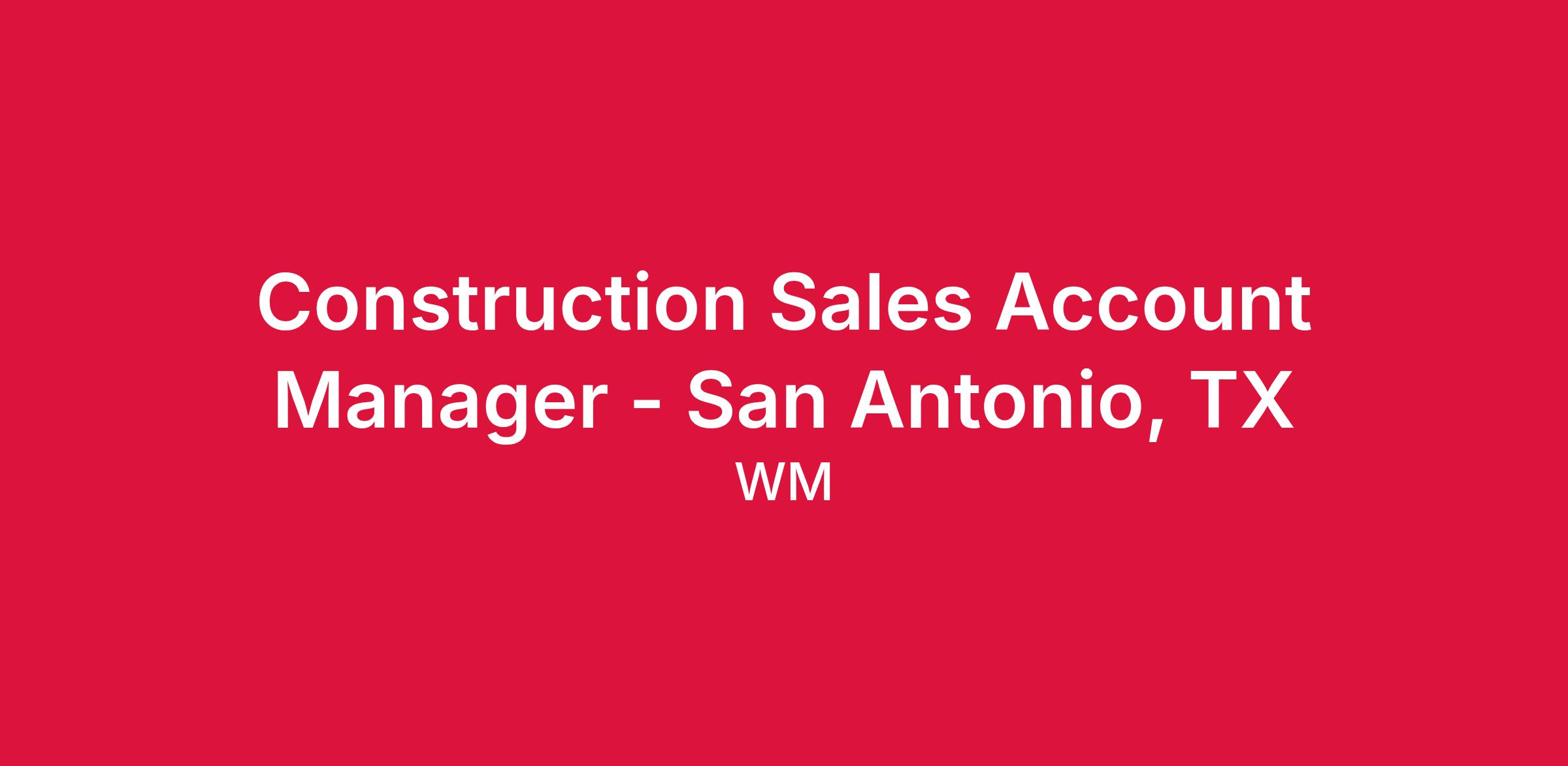 The Construction Sales Account Manager (CSAM) will cover a territory in San Antonio, TX. Candidates need to be local to the area. This position is a combo hunter / farmer, meaning you will be responsible for new business (hunting) as well as retention of existing accounts (farming). However, 70-80% of your time will be spent hunting and finding new business. Prior outside / field sales experience in a construction setting will be preferred.