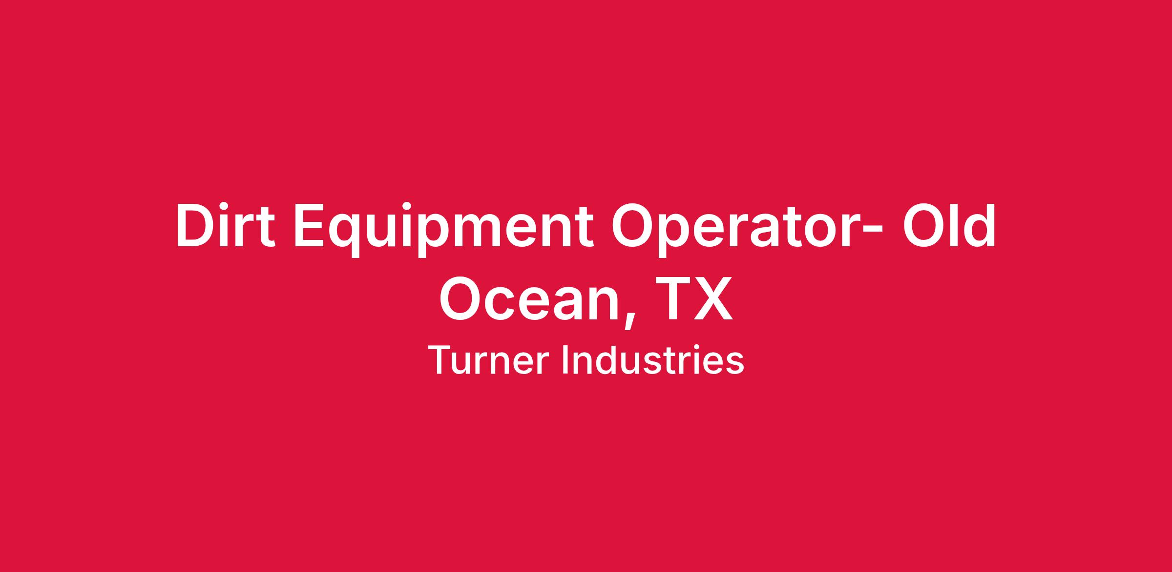 Turner Industries Group is accepting resumes for a Journeyman Dirt Equipment Operator for a maintenance position in Old Ocean, TX.