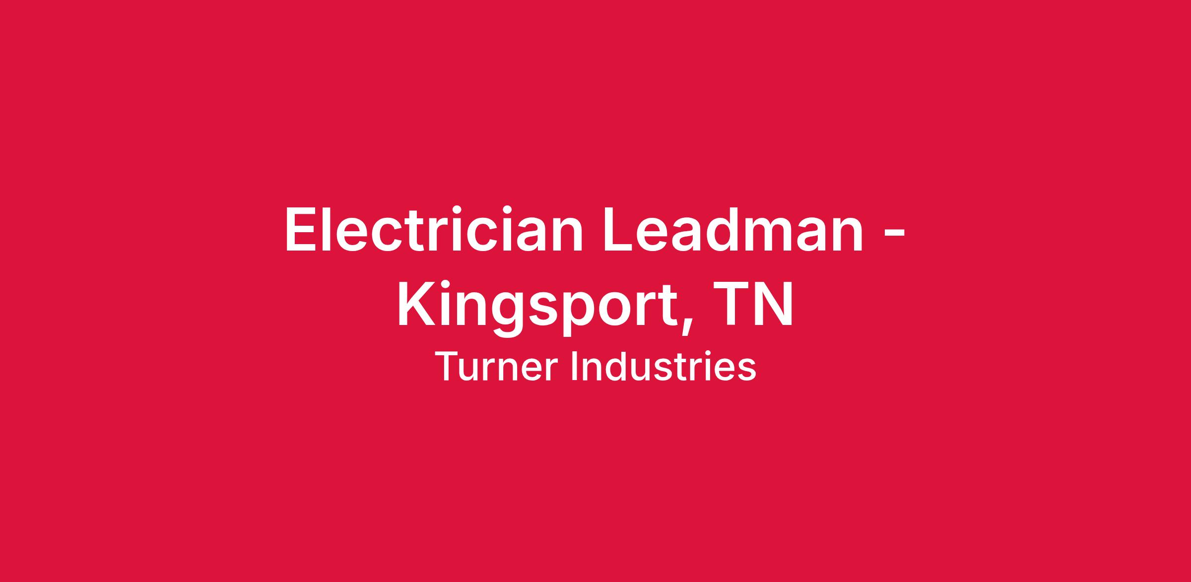 Turner Industries Group, LLC has an opening for an Electrician Leadman to join our team in Kingsport, TN. The Electrician position plans layout, installs and repairs wiring, electrical fixtures and control equipment. Non-exempt role; Reports to the Foreman; Assigned duties according to specific procedures / work is checked frequently.