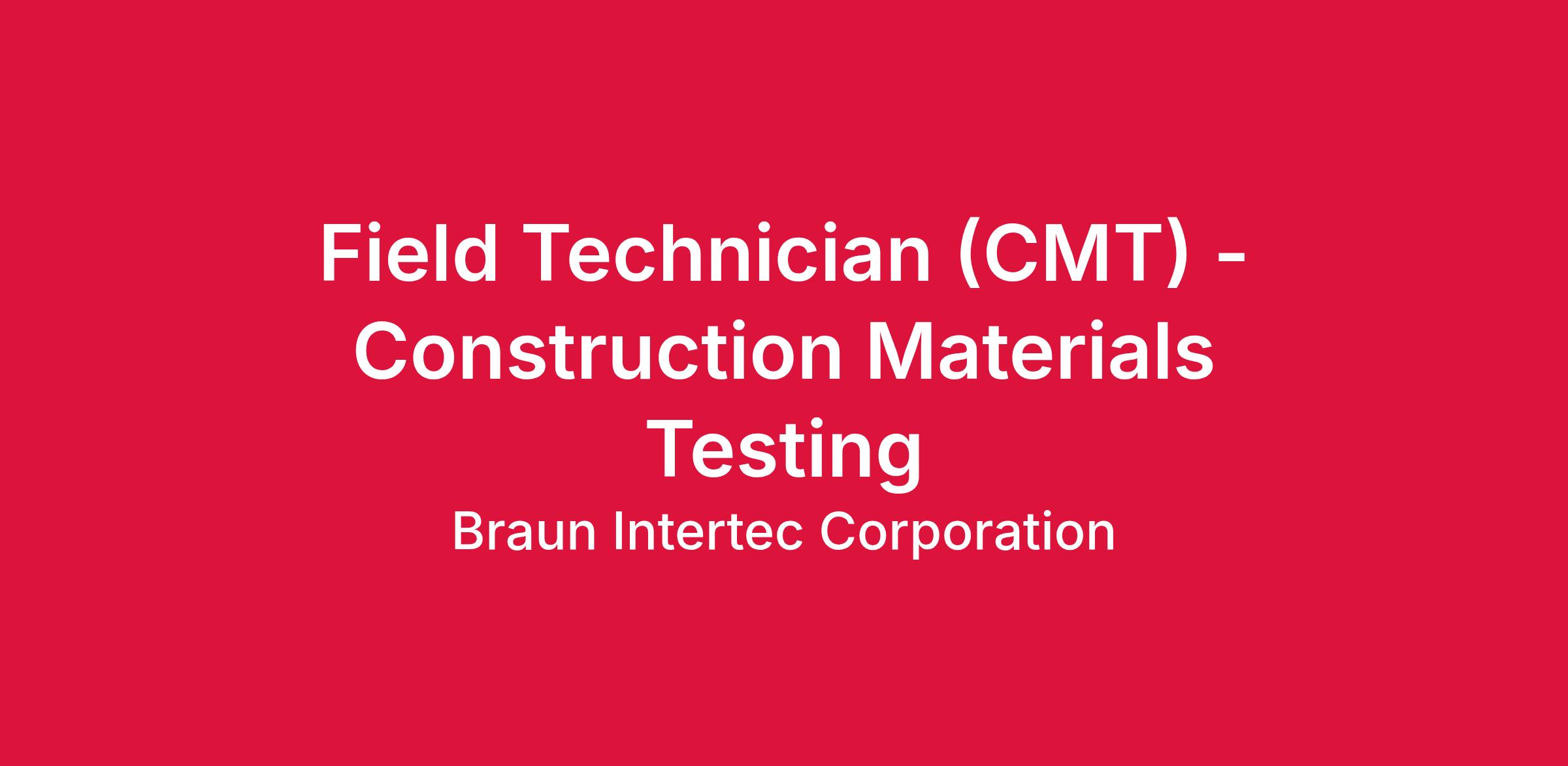Braun Intertec is seeking Experienced Construction Materials Testing (CMT) Technicians to join our Lenexa, KS office. As a technician, you will perform a variety of testing on construction materials such as soils, concrete, masonry, and asphalt.Β Onsite materials testing is conducted on various industrial, commercial and transportation construction projects located throughout the region.