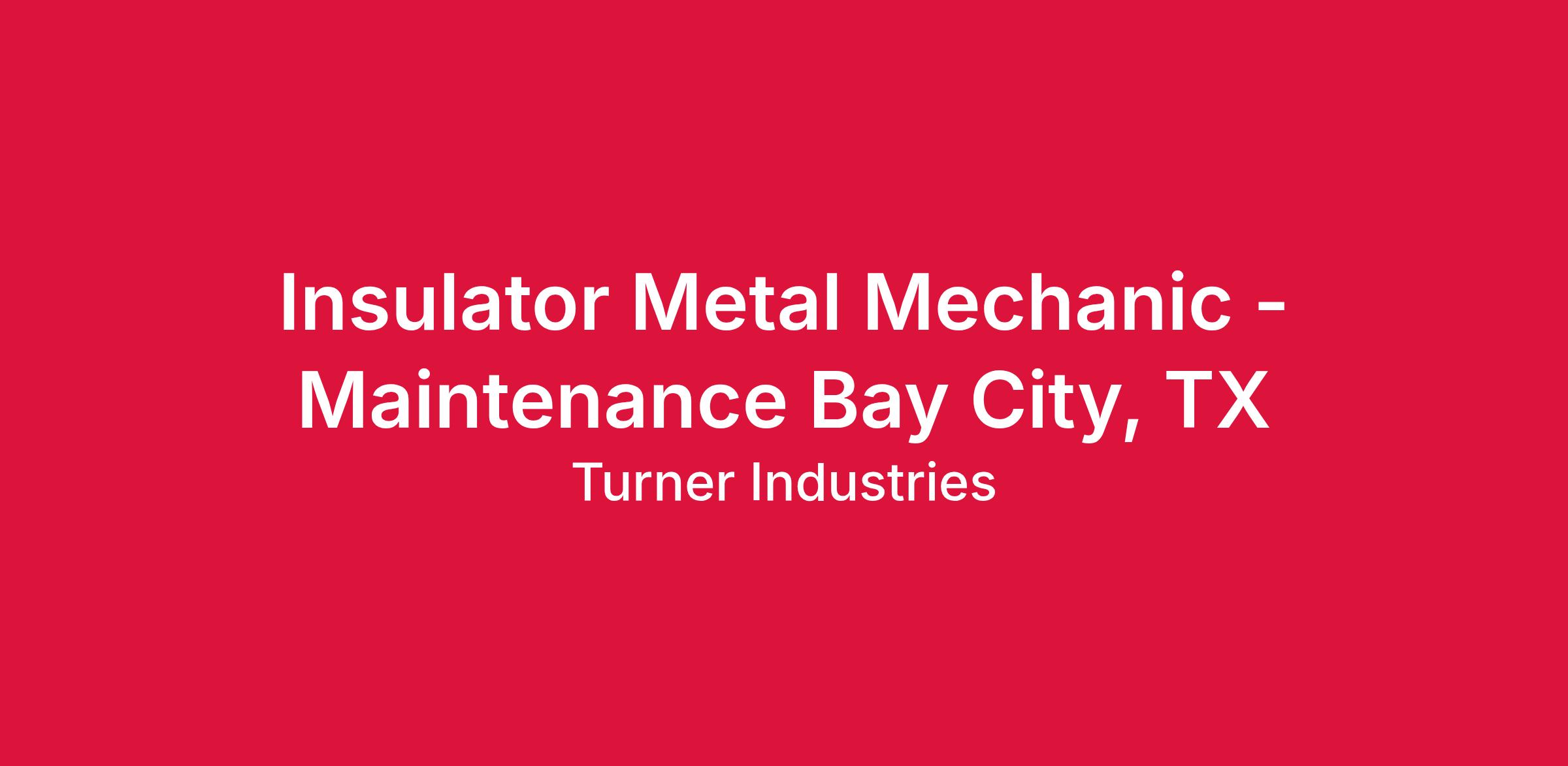 Turner Industries Group is seeking Journeyman Insulators for Maintenance in the Bay City, TX area.