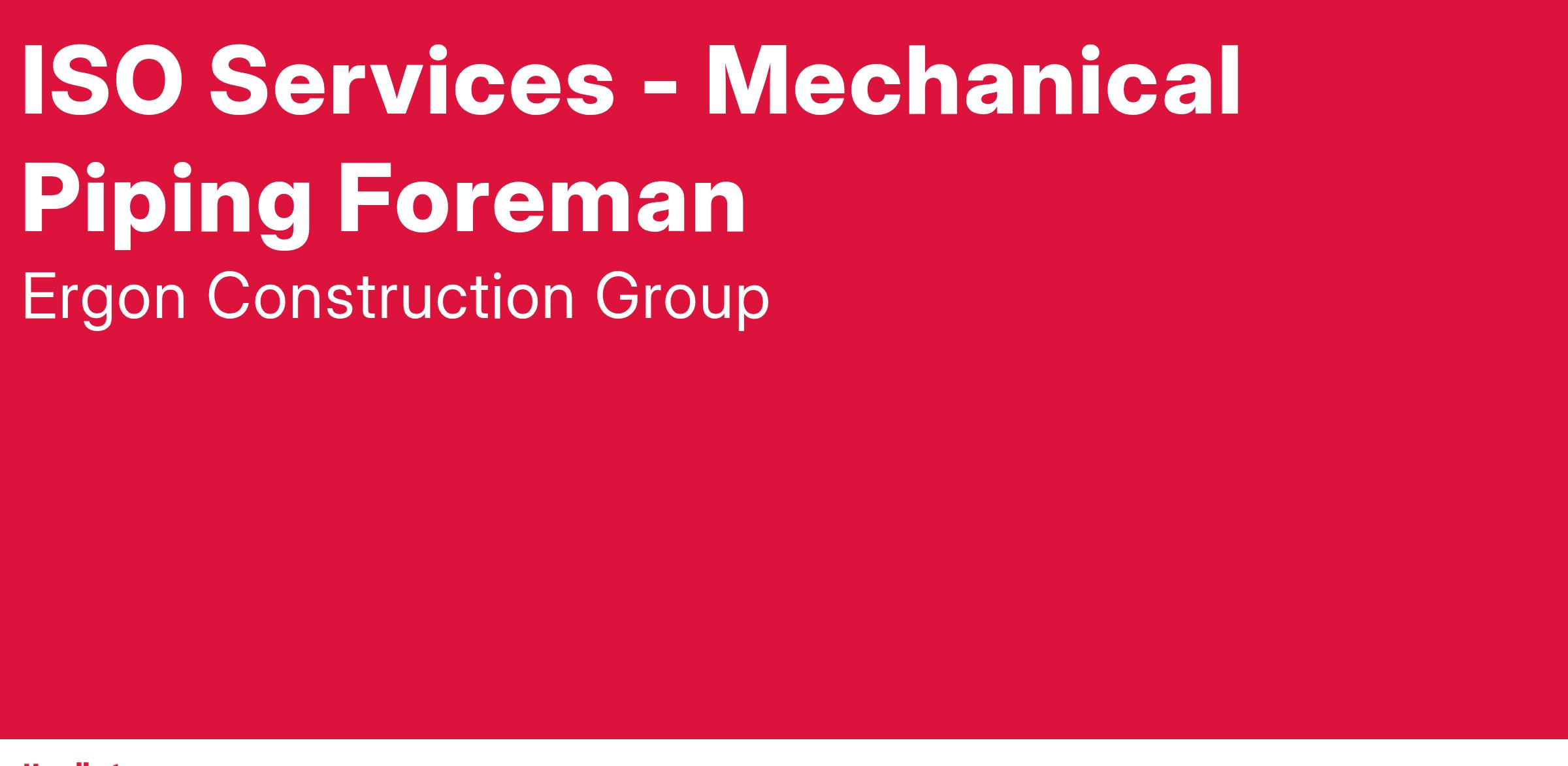 The Mechanical Piping Foreman position is a support position to ISO Services. The Pipe Foreman is responsible for supervision of fabrication, installation, and repair of piping, steel structure, and associated equipment, and for other activities involving ISO Services.