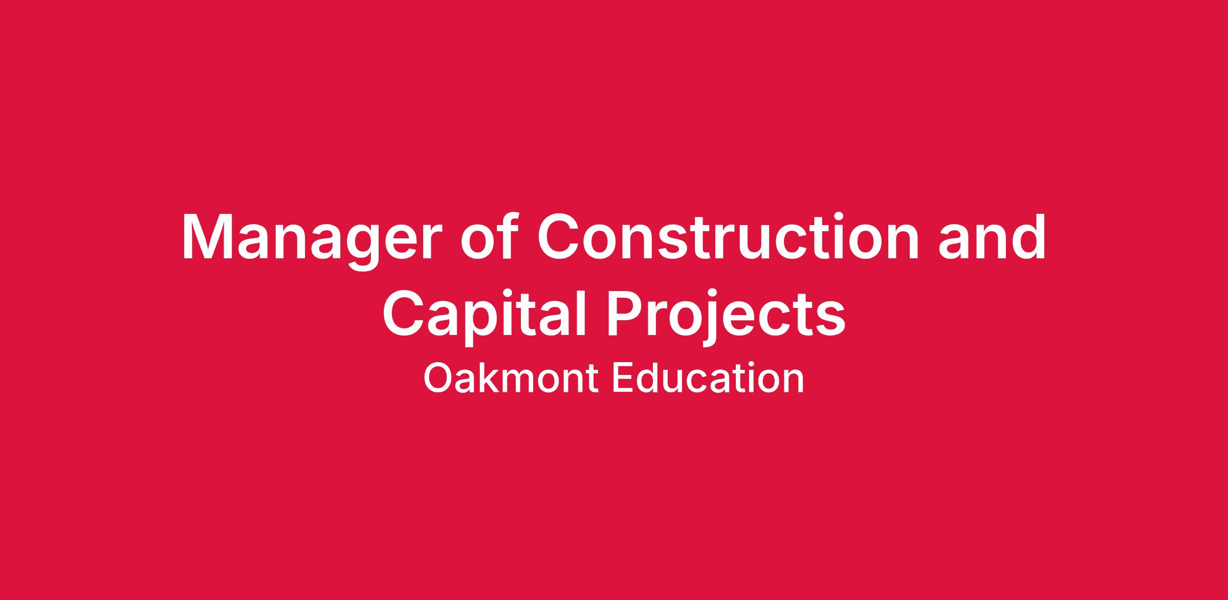 The Manager of Construction and Capital Projects leads the day-to-day execution of Oakmont’s capital construction and renovation projects and supports facilities operations across the network. Reporting to the Head of Facilities and Capital Project Delivery, this role is responsible for managing project plans, vendor coordination, site oversight, and documentation to ensure projects are delivered on time, on budget, and in alignment with Oakmont standards.