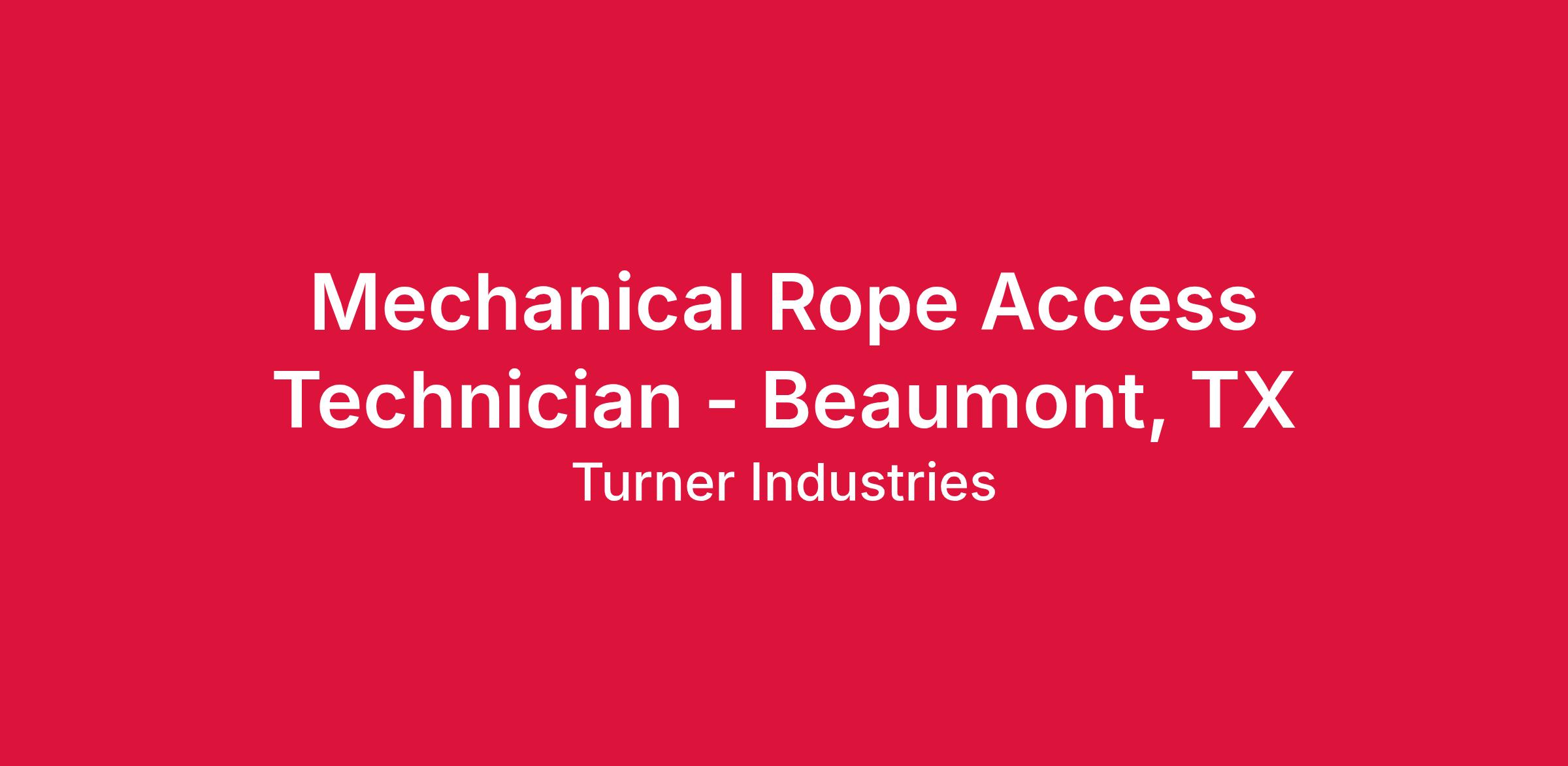 We are seeking a Mechanical Rope Access Technician for a position in Beaumont, TX. The Rope Access Technician is responsible for carrying out standard rope access operations to perform maintenance, repairs, and other industrial work tasks on industrial petrol/chemical equipment while on ropes. The technician must have the ability to perform work that is physically demanding, have good communication skills and the ability to assimilate a large amount of new information. Responsibilities may also include rescue operations, technical reports, and administrative tasks. Non-exempt role; Reports to Area Manager; Develops procedures for performance of variety of duties / performs complex duties within established guidelines.