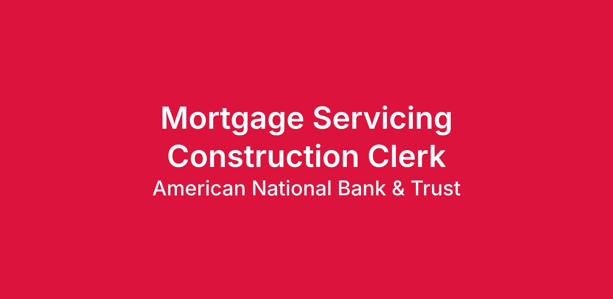 The Mortgage Servicing Construction Clerk will be responsible for all day-to-day construction draw processes, back-up for the Collections Department, reporting for construction loans, and working Release-of-Liens.