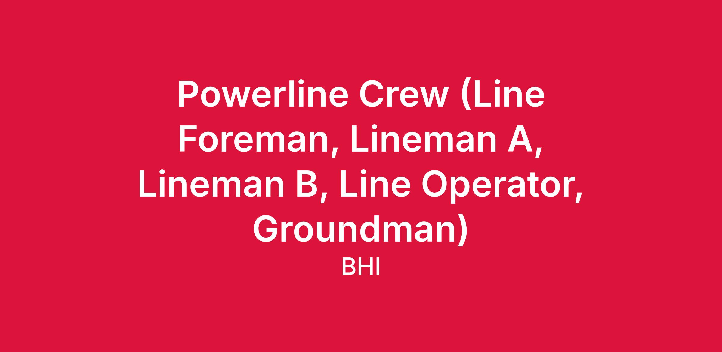 As a Powerline Crew, you will earn a competitive wage: Line Foreman $46-54 per hour, Lineman A&B $36-46 per hour, Operators $30-36 per hour and Groundman $25-30 per hour (all pay depending on experience). This position requires travel, and qualified applicants will be eligible for per diem. You will also be eligible for benefits including health, vision, dental, life insurance, a 401k plan with match, and paid time off (PTO). If this sounds like the opportunity you've been looking for, please fill out our initial 3-minute, mobile-friendly application.