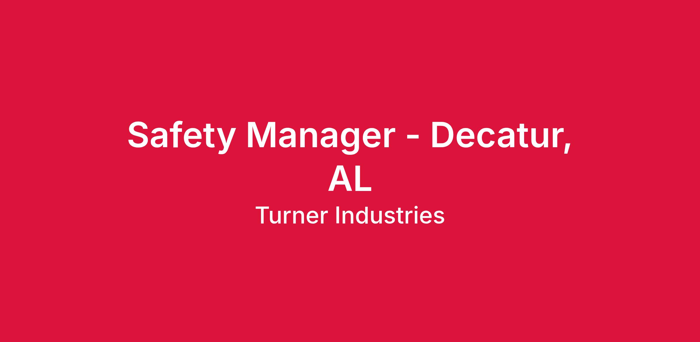 Turner Industries Group, LLC has an opening for a Safety Manager to join our Team in the Decatur, AL area. Candidate must be within 60 miles of the job site. The Safety Manager will be responsible for assisting in the administration and overall facilitation of Site/Project Industrial Safety programs to maintain a safe and healthy work environment.