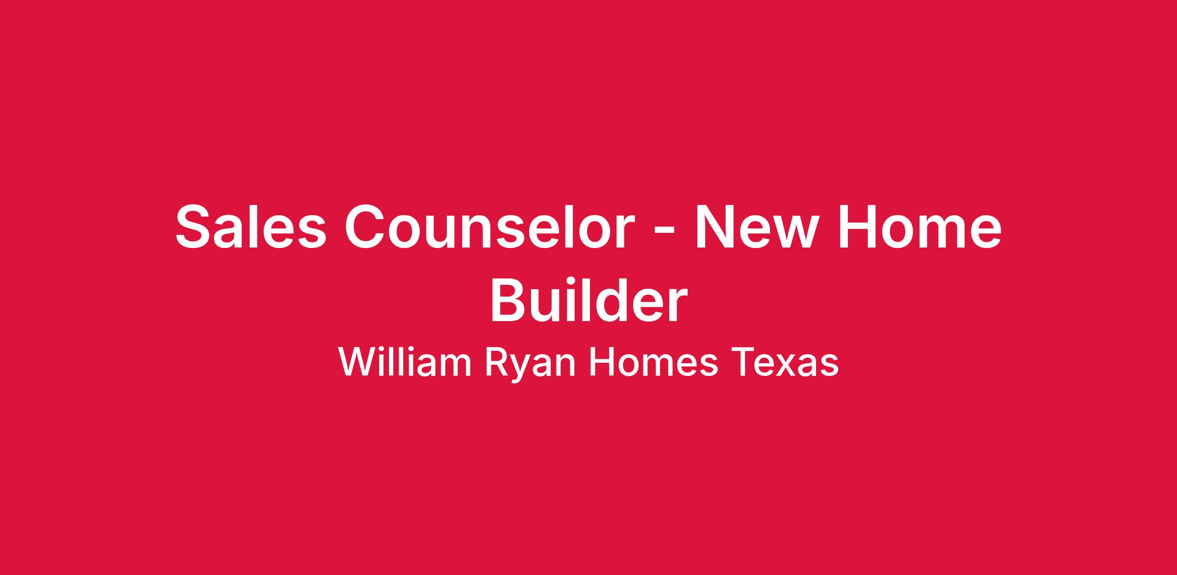 Residential home builder, William Ryan Homes, is looking for an experienced and highly motivated Sales Counselor to sell new homes in our Royse City, TX communities. The right candidate is committed to selling our homes in a personal and professional manner, providing 100% customer satisfaction while meeting all assigned sales goals.