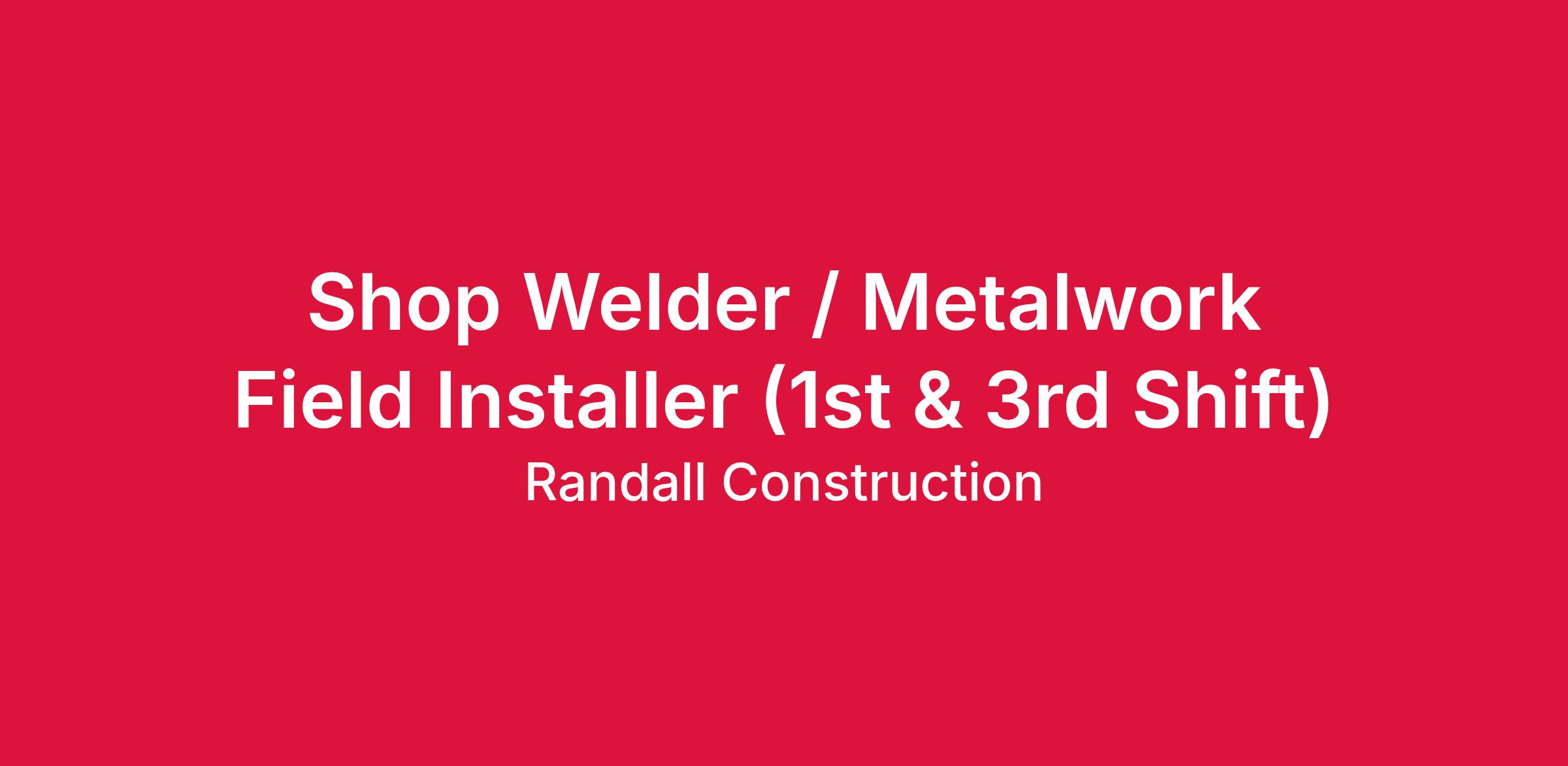 * These jobs vary between 1st (Shop) and 3rd (Field Install) Shift Work *<\/span><\/span><\/b> RANDALL is a leading self\-performing subcontractor serving Florida and the Southeast. A family\-owned company, RANDALL has deep roots in the community and is perfectly positioned as an innovator in the industry. With over 400 employees and 35+ years in operation, RANDALL is an established, reliable, and trusted partner. RANDALLâs services and products are delivered through our 100,000 sq. ft. Fabrication facility, set on 25 acres in Central Florida.<\/span><\/span><\/span><\/span><\/span><\/span><\/span><\/span> Randall Architectural Ironworks (RAI)<\/span><\/span><\/span><\/span><\/b> is seeking Metalwork Field Installers \/ Welders. <\/b>We work behind the scenes at Orlando's top attractions and venues.<\/span><\/span><\/span><\/span> Physical Requirements:<\/span><\/span><\/span><\/b><\/span> You must be able to lift a dead weight of at least 50 pounds<\/span><\/b> and stand on your feet for several hours at a time. <\/span><\/span>You must also be able to bend, stretch, crouch, and lift<\/span><\/b> as required by the job<\/span><\/span><\/span>, be able to respond quickly to sounds, move safely over uneven terrain or in confined spaces, see and respond to dangerous situations, safely climb ladders while carrying tools\/items, work in extreme weather, and properly wear personal protective gear.<\/span><\/span> Our selection will be driven by the skills \/ qualifications above as well as the ability to develop relationships with clients and co\-workers to maximize your professional opportunities.<\/span><\/span> <\/span><\/span> We seek dynamic individuals who are ignited by challenge and opportunity for personal and professional growth. Are you ready to take the next step in your career? We have long\-term opportunities for hard\-working people who want to join a winning team. RANDALL offers competitive compensation, health benefits, insurance, matching 401(k), and paid time off. <\/span><\/span> <\/span><\/span> We look forward to reviewing your resume!<\/span><\/span><\/span><\/span> <\/span><\/span> Randall is a drug free workplace.<\/span><\/span><\/span><\/b> #RandallHiringNow<\/span><\/span><\/span> Randall does not accept unsolicited resumes from individual recruiters or third\-party recruiting agencies without pre\-approval from Randallâs Recruiting team. Pre\-approval is required before any external candidate can be submitted. Randall will not be responsible for fees related to unsolicited resumes and for candidates who are sent directly to our hiring managers or any other management \/ staff (bypassing Recruitment staff).<\/span><\/span><\/span><\/i><\/b>