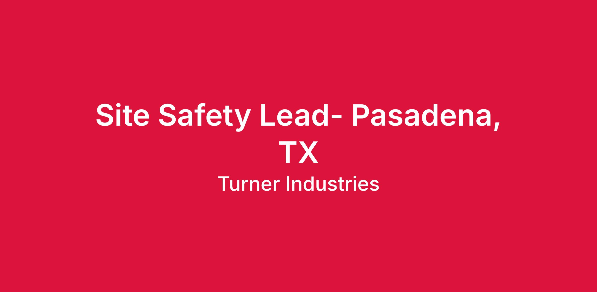 Turner Industries Group is looking for a Site Safety Lead to join our team in the Pasadena, TX area. This position will be responsible for overseeing and implementing HSE procedures, programs, processes, and systems to ensure compliance with regulatory and company requirements and to eliminate or minimize HSE risks to the Company, its employees, the environment and the community surrounding the facility. This position will also represent Turner in meetings with the client, governmental agencies & contractors to resolve immediate safety issues.