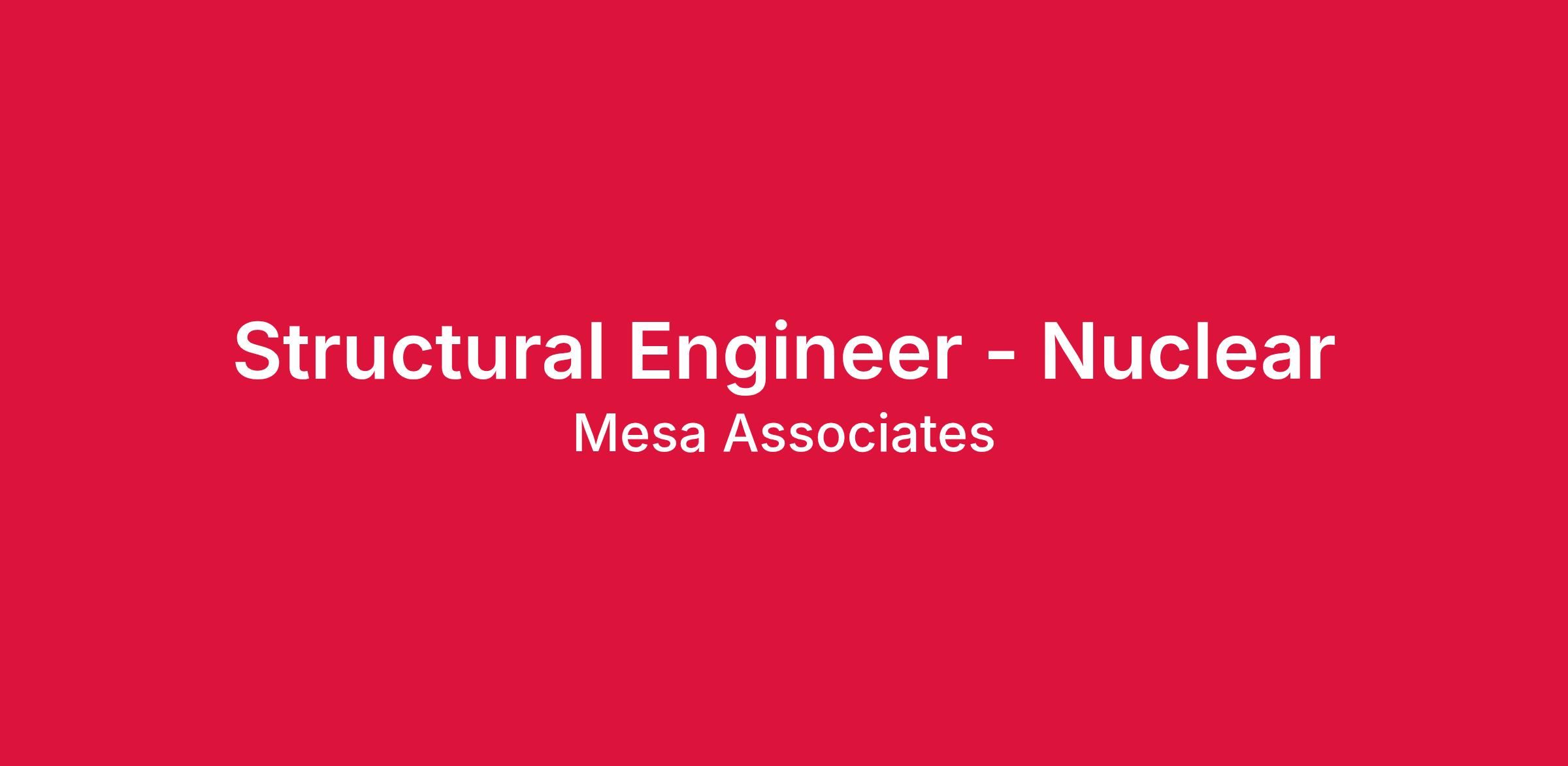 Mesa Associates is seeking a Licensed Structural Engineer to join our nuclear services team and contribute to the design, analysis, and construction of nuclear facilities. This is an opportunity to play a critical role in the engineering and design processes for commercial nuclear power generation. Mesa's strategic growth strategy for our commercial nuclear division is to create a ready service pool of available staff to support proposals and projects in nuclear generation.