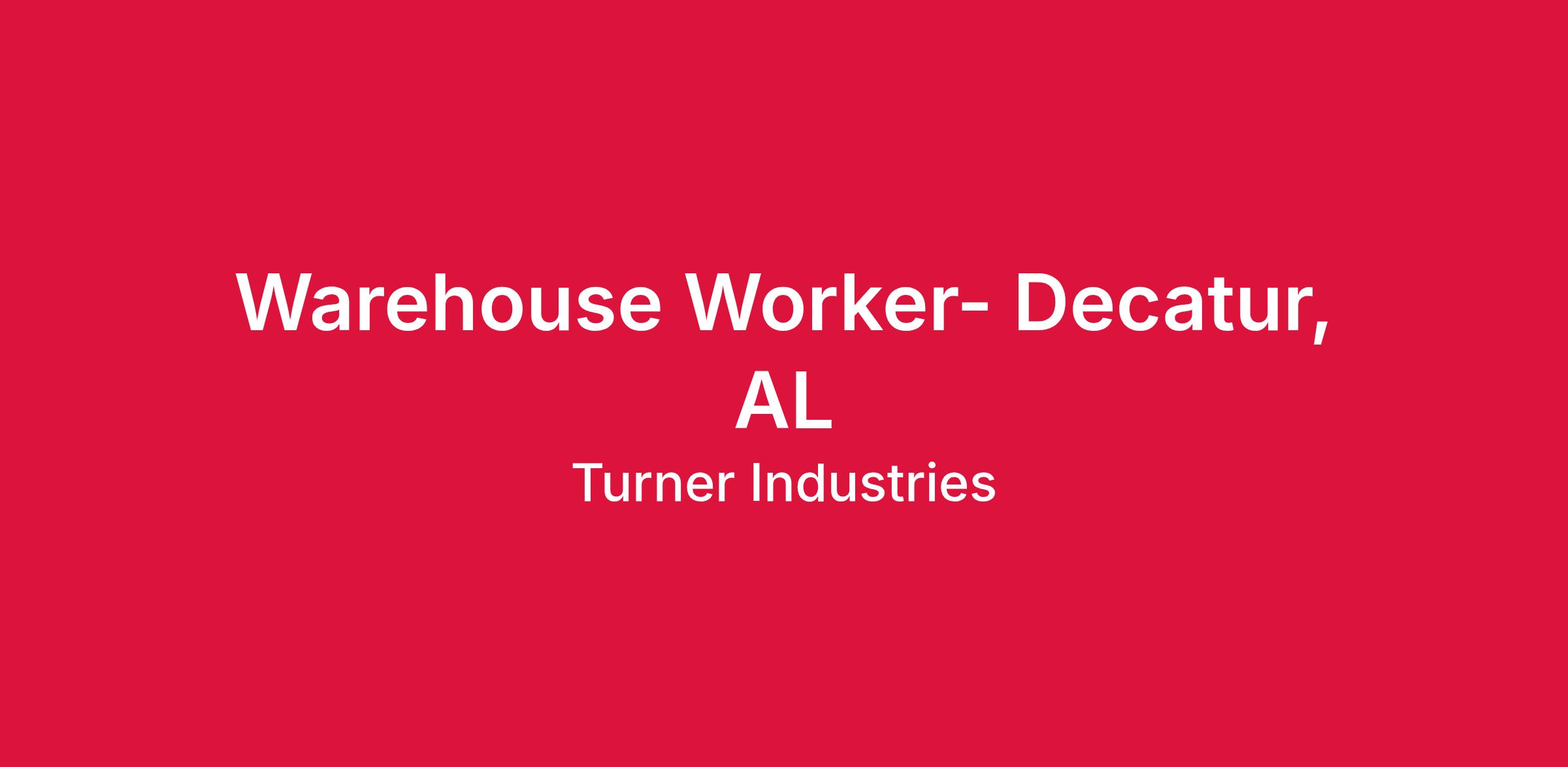 Turner Industries Group, LLC has an opening for a Warehouse Worker to join our Team in the Decatur, AL area. The warehouse worker will be responsible for receiving, storing, and distributing material, tools, equipment, and products.